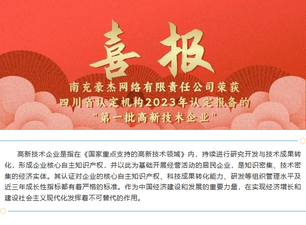 喜報|南充豪杰網(wǎng)絡(luò)有限責(zé)任公司榮獲四川省認(rèn)定機(jī)構(gòu)2023年認(rèn)定報備的“第一批高新技術(shù)企業(yè)”